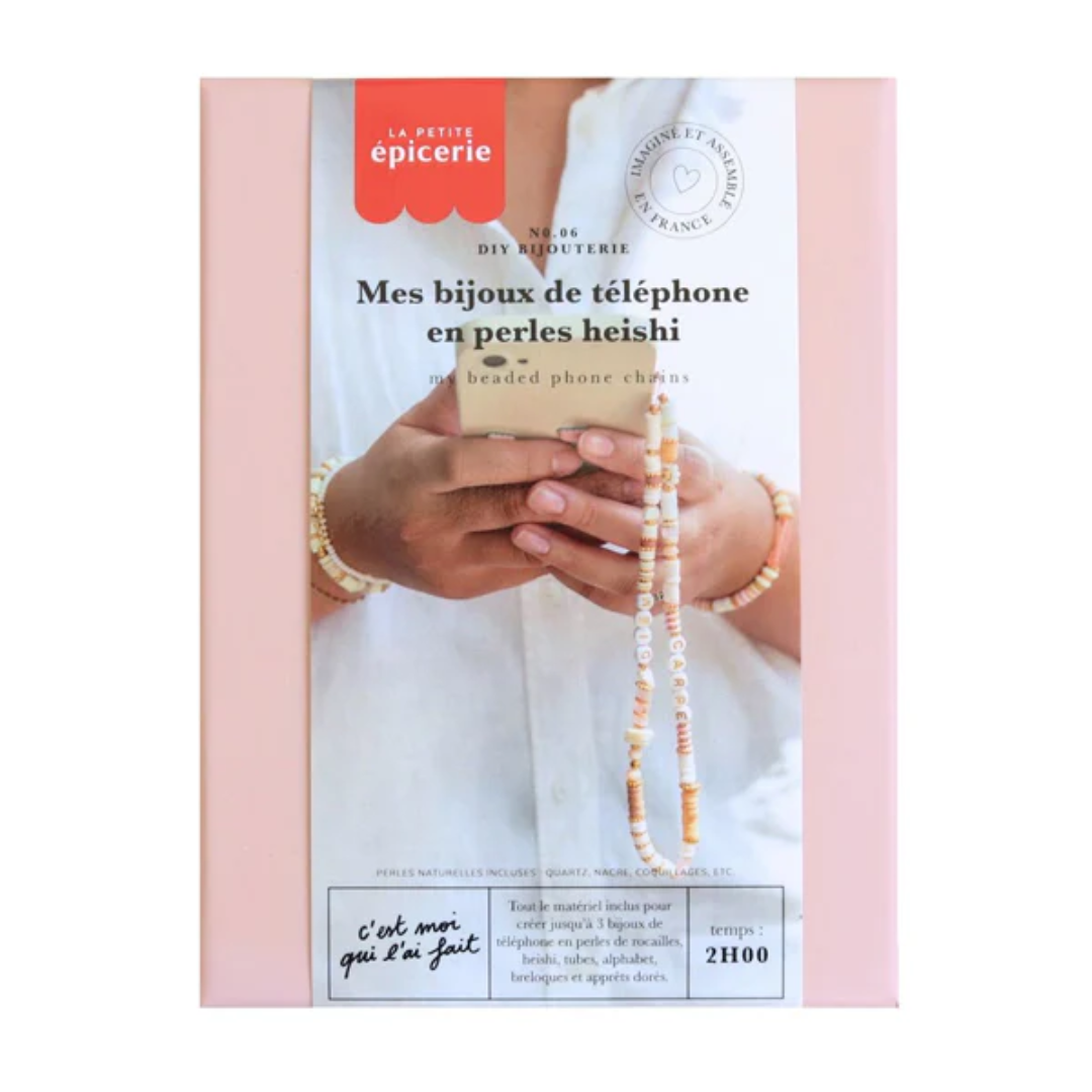 1 bag of gold findings and random beads (heishi, natural, seed beads, spacers) / 4 tube beads / beads with the letters "carpe diem" / 1 spool of transparent elastic thread / 2 m of beige jade thread / 1 needle / an explanatory booklet / Up to 3 phone charms |