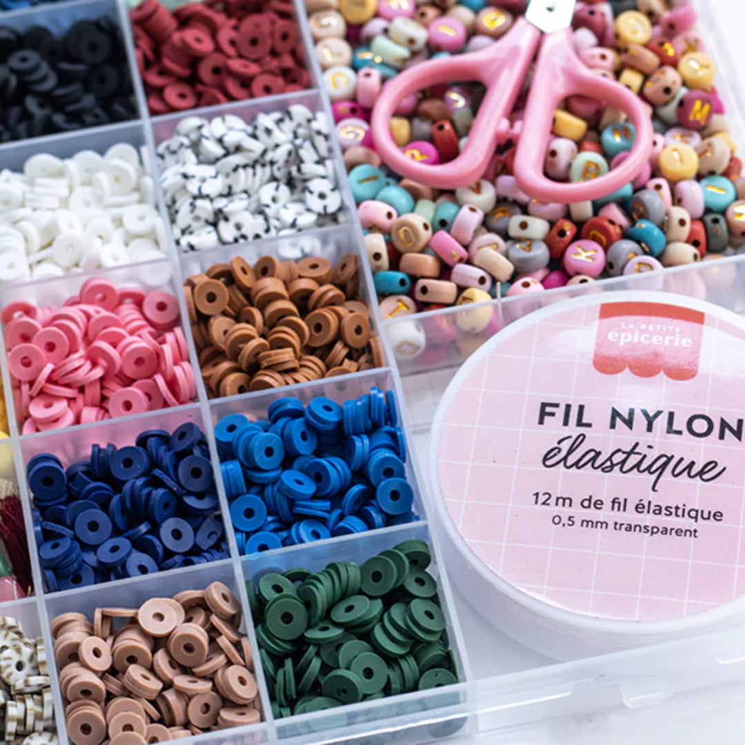 Heishi Beads: The box contains 16 different colors of Heishi beads / Gold Spacer Beads: A special compartment is dedicated to gold spacer beads / Tube Beads: elongated and cylindrical / Shell Beads and Pom-Poms / Letter Beads / Scissors and elastic thread |